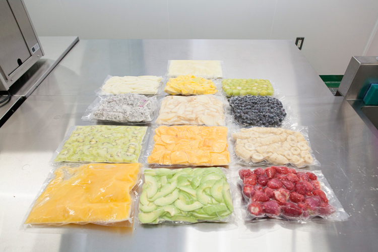 そのような背景の中、2017年、泉州屋では「泉州屋ラボ」を東部市場内に開設、凍結加工事業をスタートしました。果実の品質劣化を最小限に抑えることで、用途の汎用性を高める「急速冷凍機」を配置、冷凍加工は、果物の「一番おいしい時期」に冷凍保管ができることがメリットとなります。また、規格外商品など廃棄されてしまう果実を冷凍カット加工やピューレ加工することにより、「食品ロス削減」にも繋がります。果樹市場の逼迫に備え、生産者との密な関係を築き、A品からC品までもれなく果実を買い取れる体制を準備しています。